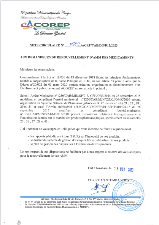 Le Directeur Général de l’Acorep rappelle aux demandeurs d’AMM des médicaments l’obligation de fournir régulièrement les documents repris dans la note circulaire.