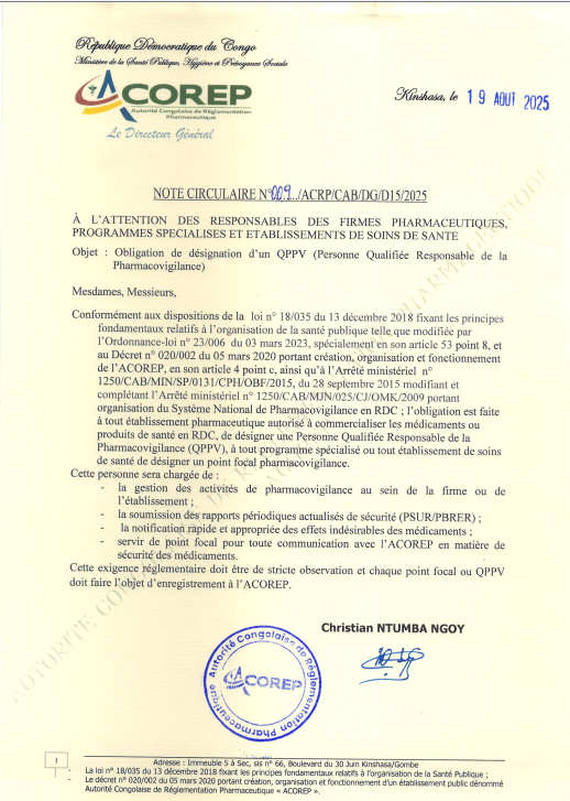 OBLIGATION POUR LES FIRMES PHARMACEUTIQUES, PROGRAMMES SPECIALISES ET ETABLISSEMENTS DE SOINS DE SANTE DE DESIGNER POUR LES UNS, UNE PERSONNE QUALIFIEE RESPONSABLE DE LA PHARMACOVIGILANCE(QPPV) ET POUR LES AUTRES, UN POINT FOCAL PHARMACEUTIQUE FAISANT L’OBJET D’ENREGISTREMENT A L’ACOREP