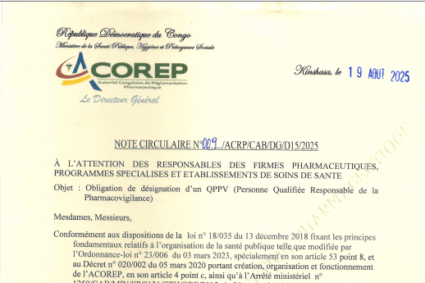 OBLIGATION POUR LES FIRMES PHARMACEUTIQUES, PROGRAMMES SPECIALISES ET ETABLISSEMENTS DE SOINS DE SANTE DE DESIGNER POUR LES UNS, UNE PERSONNE QUALIFIEE RESPONSABLE DE LA PHARMACOVIGILANCE(QPPV) ET POUR LES AUTRES, UN POINT FOCAL PHARMACEUTIQUE FAISANT L’OBJET D’ENREGISTREMENT A L’ACOREP cliquez ici pour lire la suite.