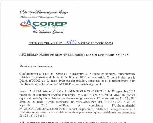 OBLIGATION POUR LES FIRMES PHARMACEUTIQUES, PROGRAMMES SPECIALISES ET ETABLISSEMENTS DE SOINS DE SANTE DE DESIGNER POUR LES UNS, UNE PERSONNE QUALIFIEE RESPONSABLE DE LA PHARMACOVIGILANCE(QPPV) ET POUR LES AUTRES, UN POINT FOCAL PHARMACEUTIQUE FAISANT L’OBJET D’ENREGISTREMENT A L’ACOREP cliquez ici pour lire la suite.